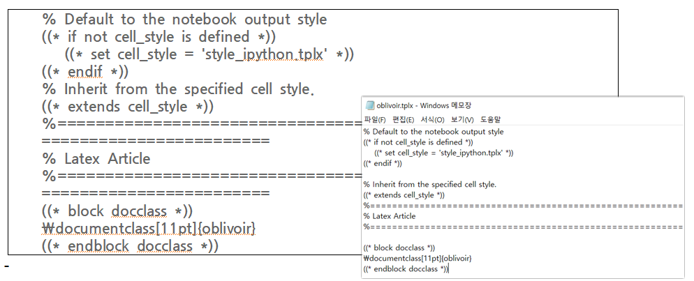 1) pdf로 저장하고자 하는 ipynb 파일이 있는 경로에 아래의 코드를 복사하여 “oblivoir.tplx” 이름으로 메모장을 이용하여 생성한다.