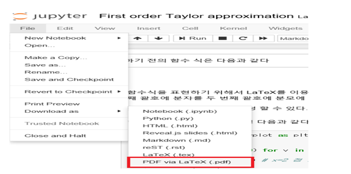 5) 주피터에서 File – Download as – Pdf via Latex via(.pdf) 선택하여 저장